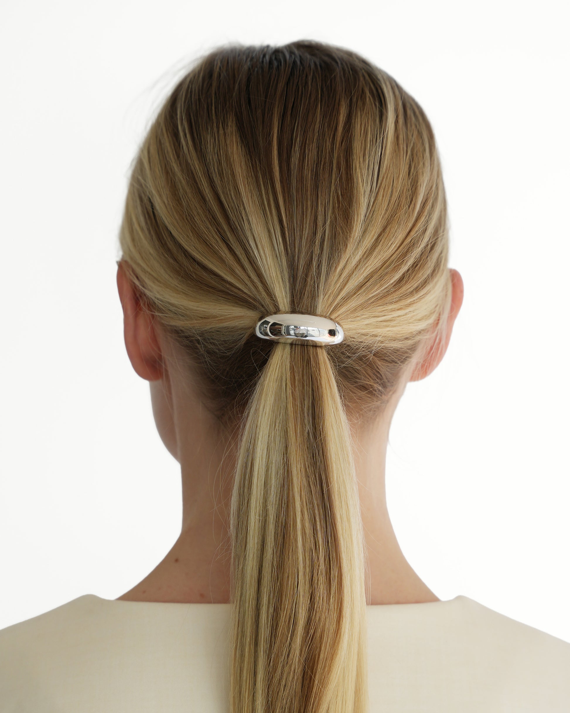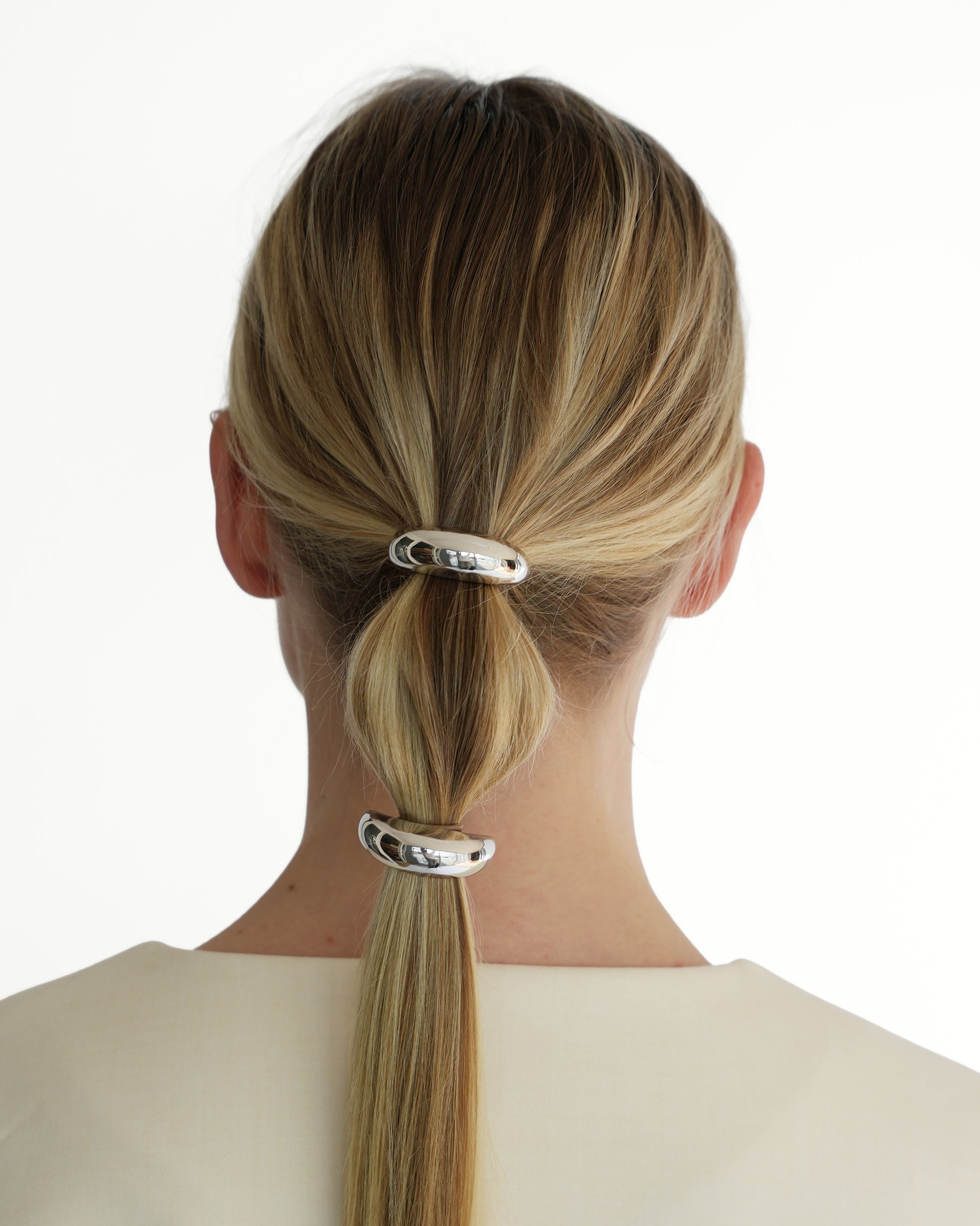 Our beloved small Moon design is back, now elevated with eco brass and 14k white gold plating. Perfect for all hair types, whether thick or fine, and versatile enough to be worn at the beginning or end of a ponytail, the end of a braid, a segmented ponytail, and more. Handcrafted with a discreet elastic for a secure and comfortable fit. Available in a gold or silver finish.